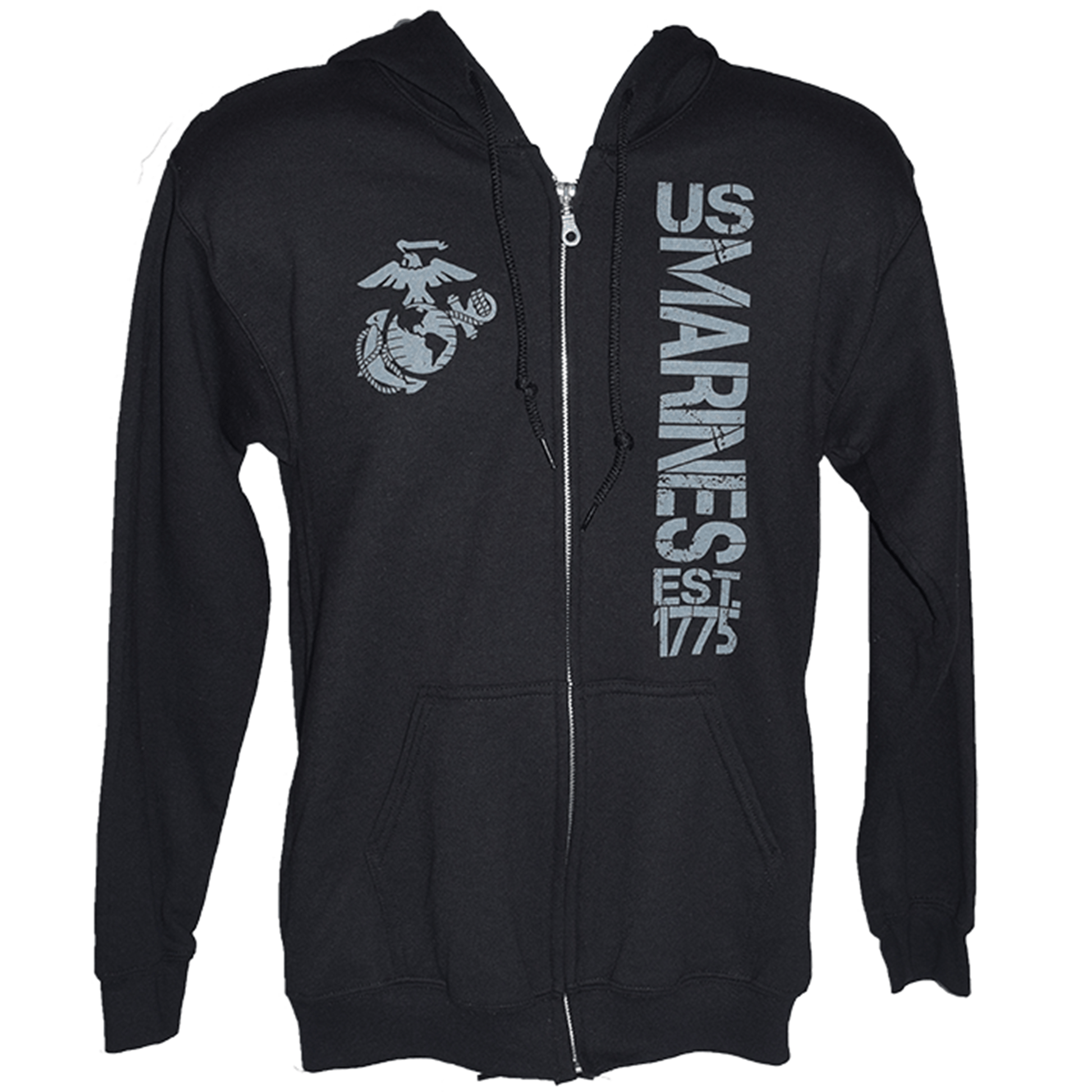 This cozy USMC full zip hoodie proudly displays the Marine Corps EGA with the words "U.S. Marines Est 1775" written vertically on the front of the hoodie, while the back features a distressed American flag.