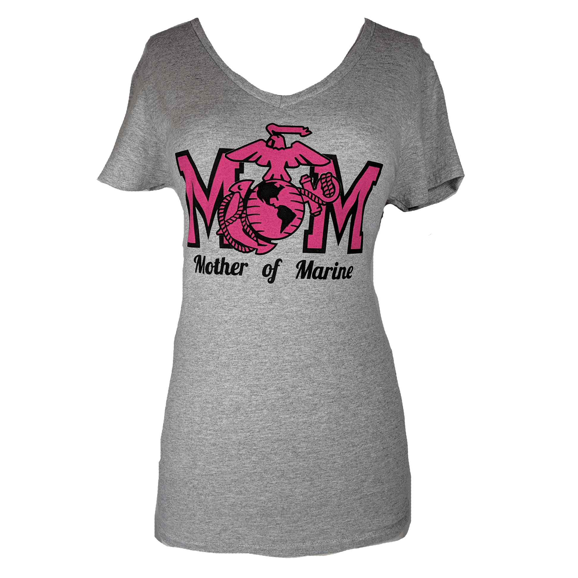 Ladies Mom of Marine V-Neck T-Shirt - Grey with Pink