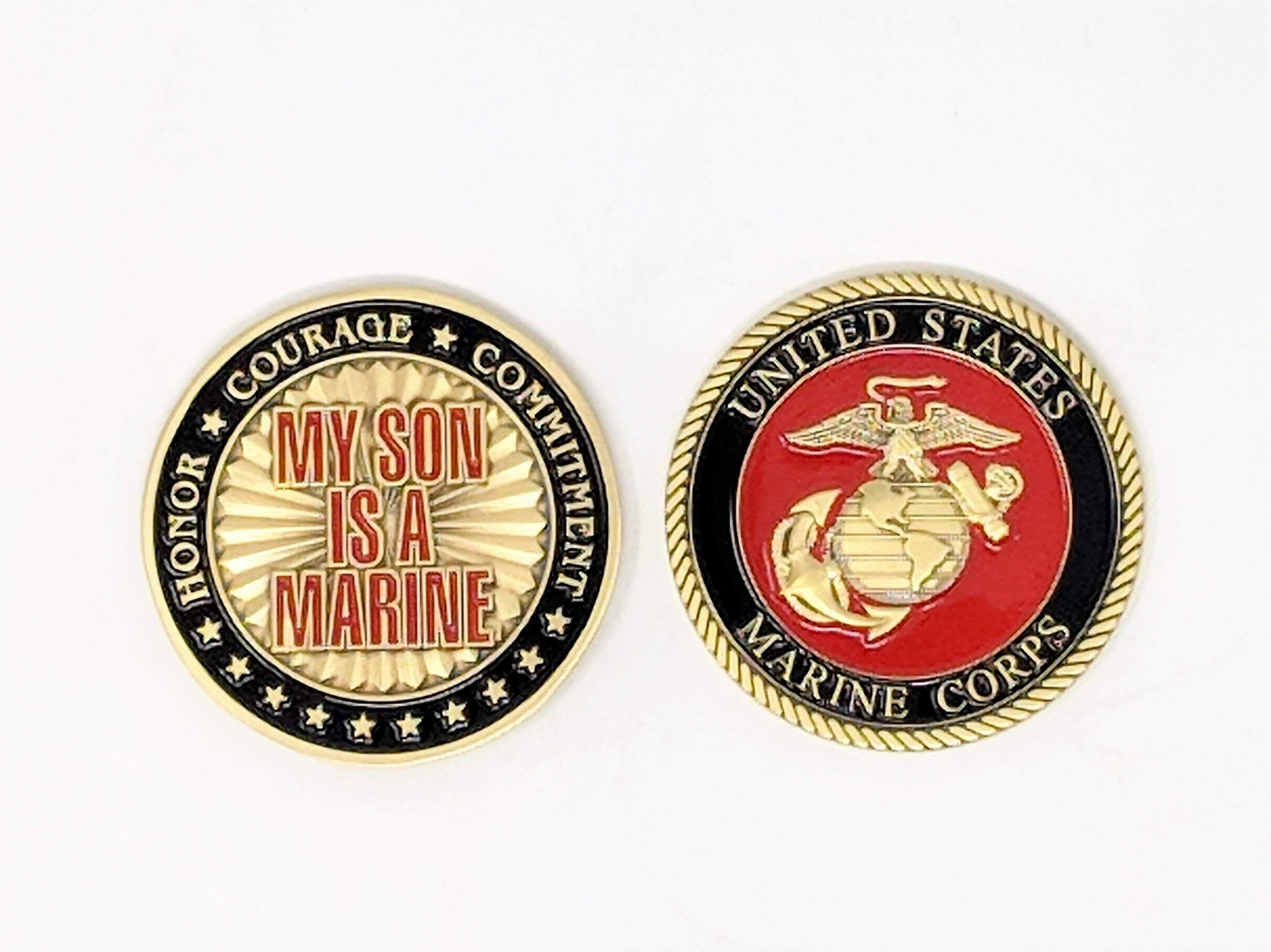 This coin has "My Son Is A Marine" with "Honor * Courage * Commitment" around the edges, while the other side has the Marine Corps EGA emblem with "United States Marine Corps" around the emblem.