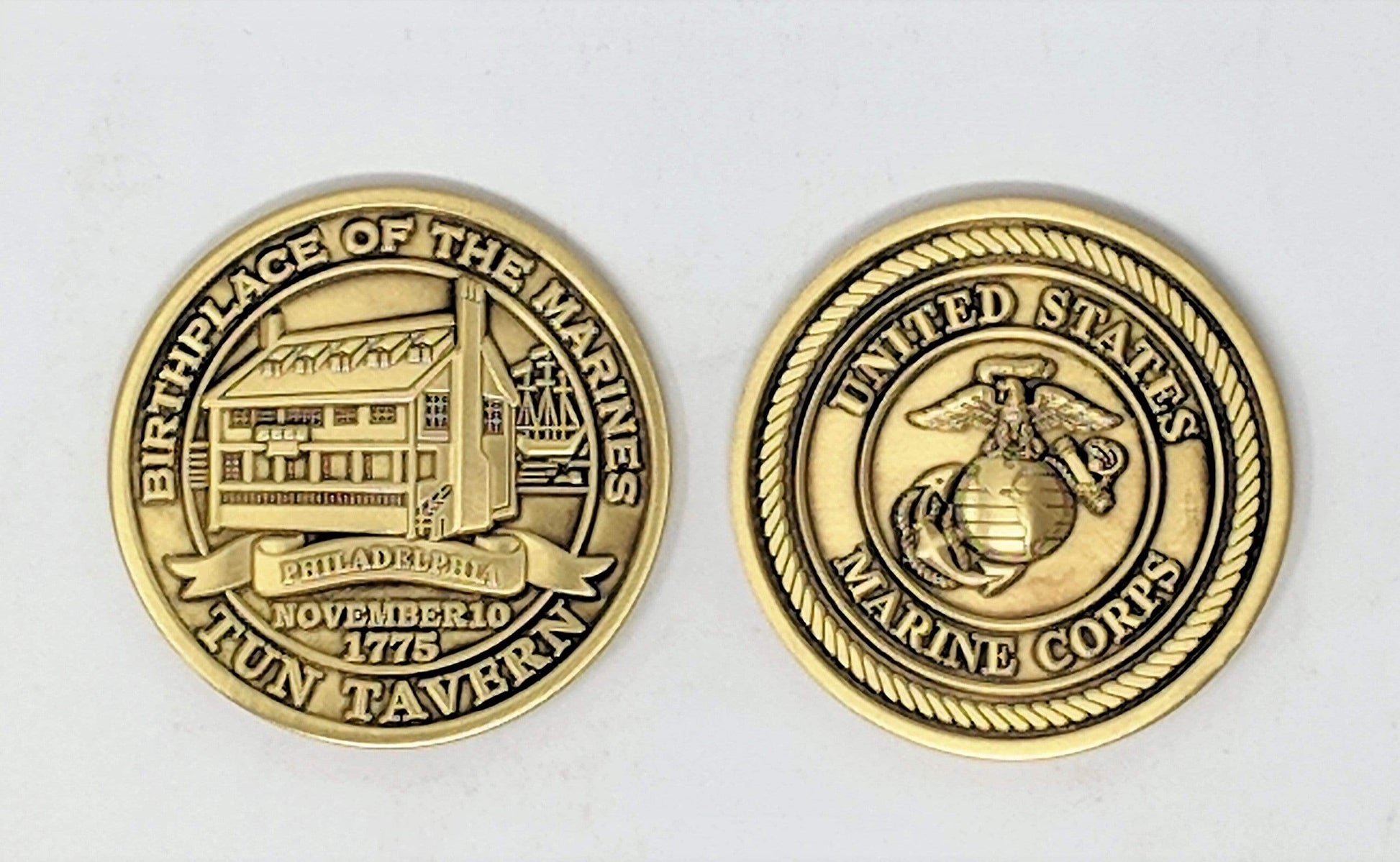 This Tun Tavern challenge coin features the Marine Corps emblem with "United States Marine Corps" on one side, while the other side of the coin has the Tun Tavern, a tavern and brewery in Philadelphia where the Marine Corps held its first recruitment drive during the American Revolution. Surrounding this image are the words "Birthplace Of The Marines - Tun Tavern."